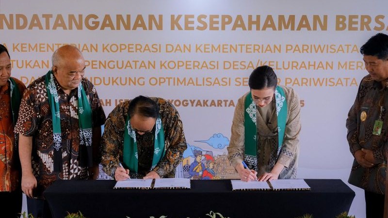 Kolaborasi tersebut diwujudkan melalui penandatanganan Nota Kesepahaman Bersama (MoU) antara Kemenpar dan Kemenkop tentang pengembangan dan penguatan Kopdes Merah Putih di Desa Widosari, Yogyakarta, Jumat (9/5/2025). MoU tersebut ditandatangani oleh Menteri Pariwisata Widiyanti Putri Wardhana dengan Menteri Koperasi Budi Arie Setiadi.