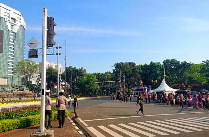 WARTALENTERA – Personel gabungan mulai menutup arus lalu lintas di kawasan Patung Kuda, Jakarta Pusat, Minggu (17/8/2025) sekitar pukul 08.10 WIB. Penutupan ini dilakukan untuk mendukung rangkaian peringatan Hari Ulang Tahun (HUT) ke-80 Kemerdekaan Republik Indonesia.