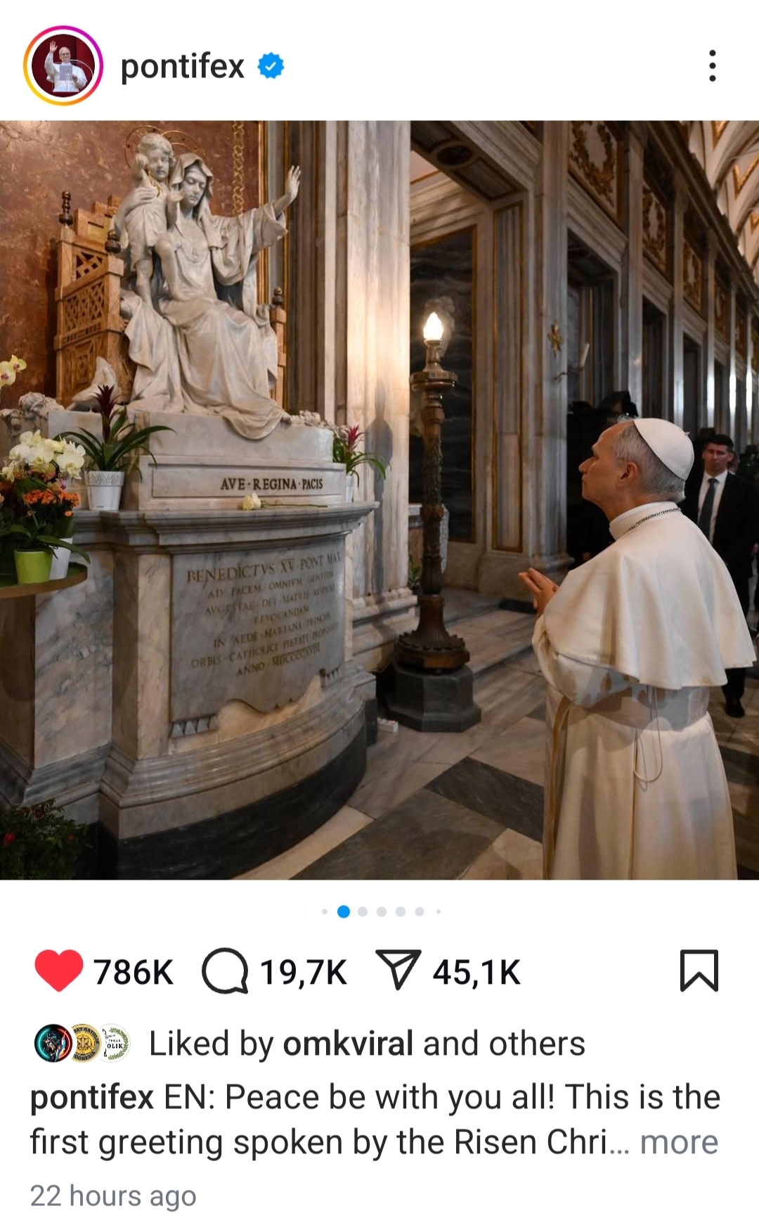 Paus ke-267 bernama asli Robert Prevost itu memiliki 7,5 juta pengikut hanya dalam waktu 22 jam sejak postingan pertamanya. Postingan perdananya berisi foto-foto Paus Leo XIV saat diperkenalkan ke publik di Vatikan.