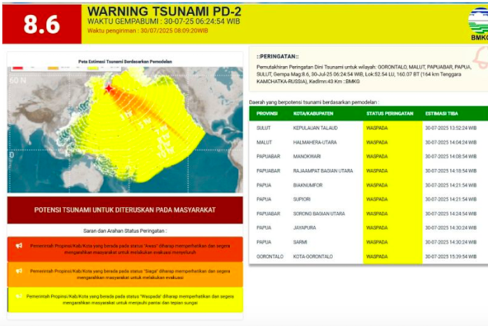 Diketahui, gempa dengan magnitudo 8,6 tersebut berpusat di wilayah tenggara Kamchatka, Rusia, dan terjadi pada 30 Juli 2025 pukul 06:24:54 WIB. Gempa ini terjadi pada koordinat 52,54 Lintang Utara dan 160,07 Bujur Timur, dengan kedalaman 43 kilometer.