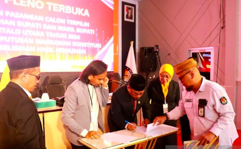 Rapat pleno terbuka penetapan pasangan calon terpilih dilaksanakan pada Kamis (29/5/2025) di Rumah Pintar Pemilu kantor KPU Gorontalo Utara. Ketua KPU Gorontalo Utara, Sofyan Jakfar, memimpin langsung jalannya pleno.